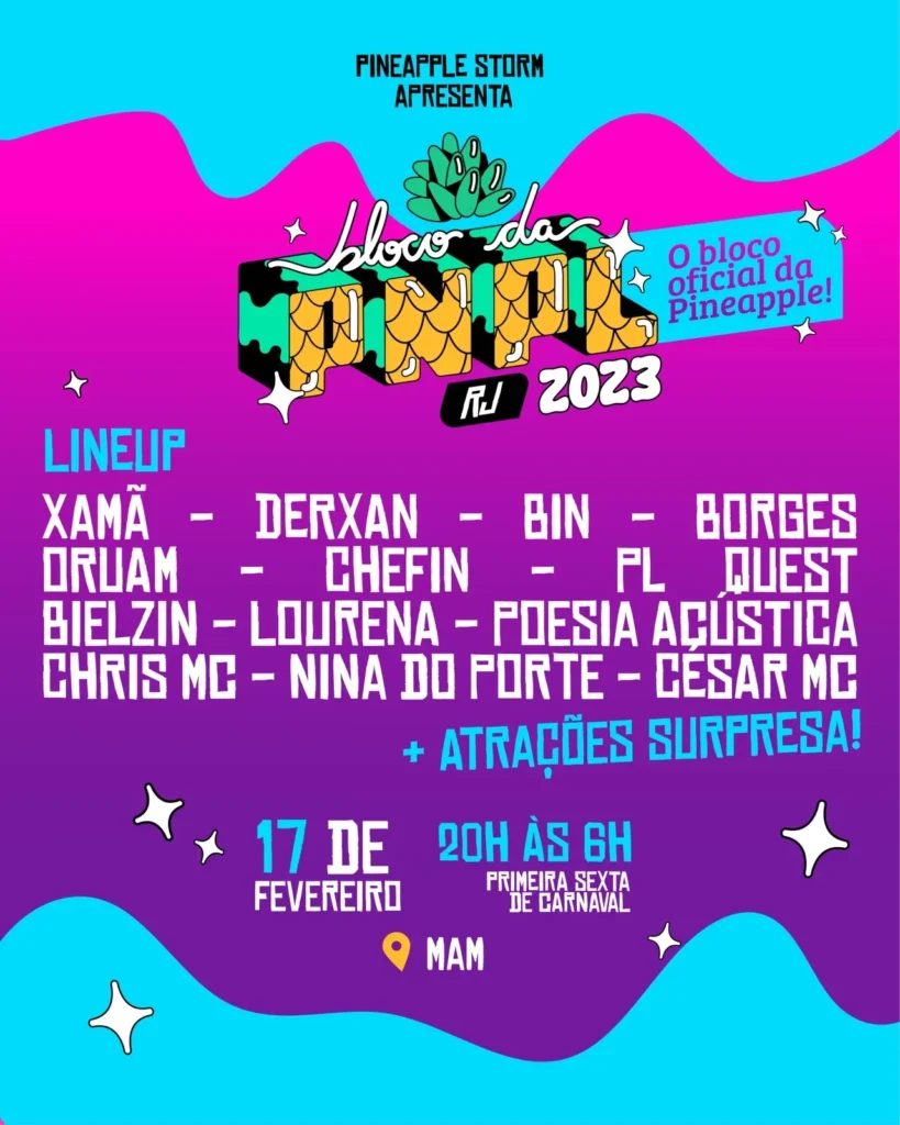 O Bloco da Pineapple chega às ruas no próximo dia 17 de fevereiro no Rio de Janeiro e vai contar com atrações como Chris Mc , Oruam, Chefin, Xamã, Derxan, Bin, Borges, Lourena, Bielzin, Nina do Porte, Cesar Mc e o elenco Poesia Acustica. Além de mais algumas atrações surpresas que devem ser anunciadas em breve.