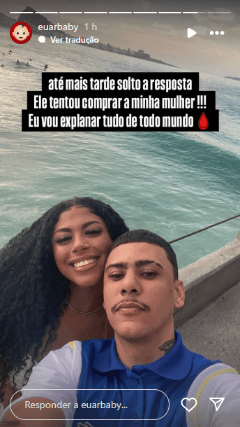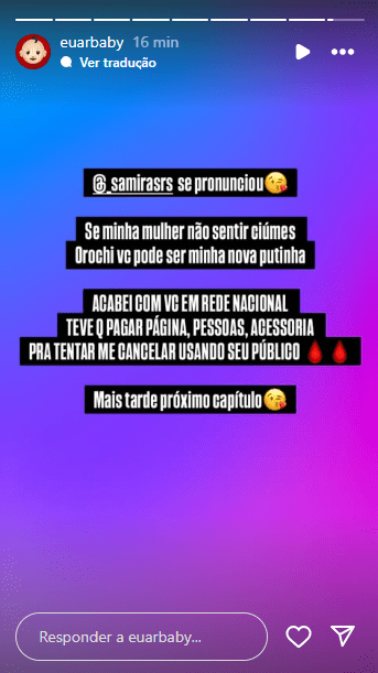 Ar Baby entendeu que de fato, o stories seria para ele e logo respondeu diretamente o stories de Orochi, chamando o artista para a briga: